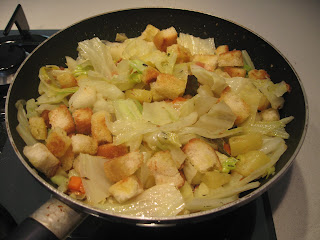 Quando os legumes estiverem cozidos, corte a batata em cubos, assim como a cenoura e corte a couve em juliana (usei uma tesoura para facilitar). Misture tudo, bem escorrido, na frigideira e adicione cerca de 2 colheres de sopa de azeite e 1 de vinagre (rectifique estas quantidades se não forem ao seu gosto). Tempere de sal e um pouco de tomilho. Misture bem, sem esmagar, e desligue o lume. Junte os cubos de pão e o alho e está pronto a servir.